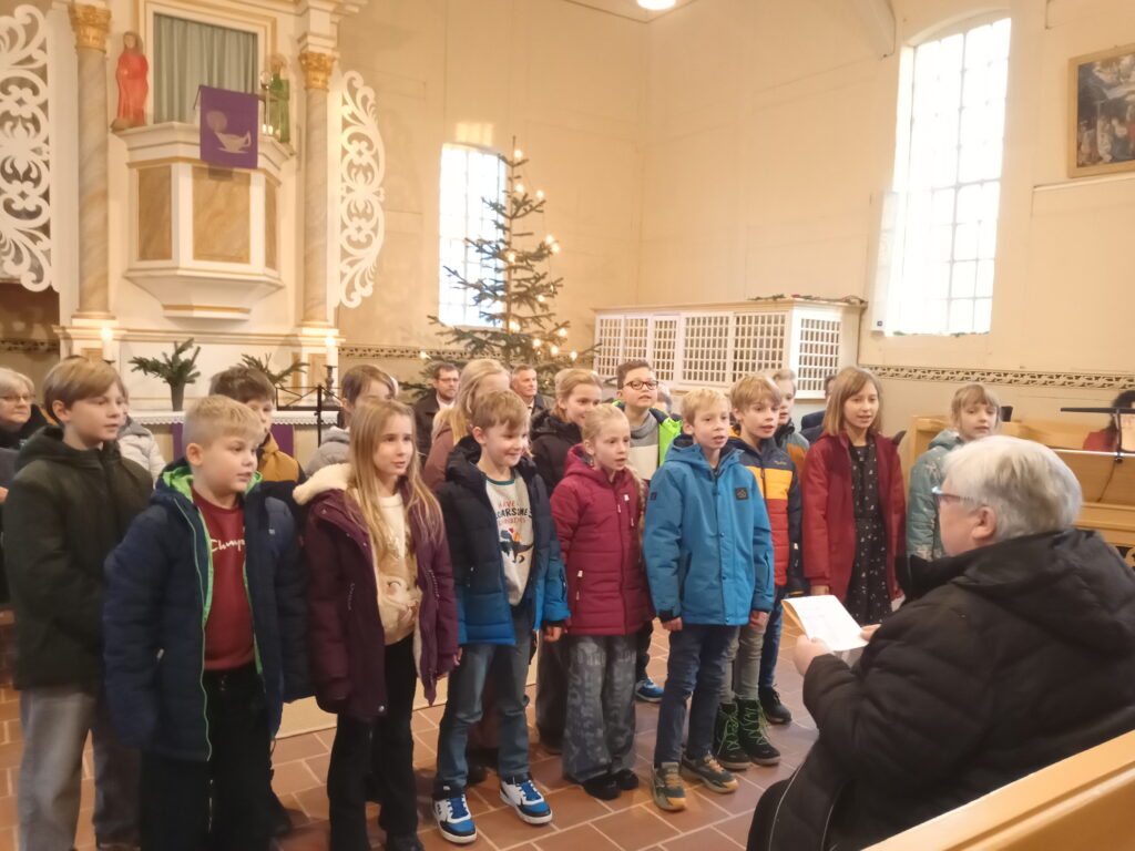 Am Sonnabend, 6.12.2025, fand wieder das traditionelle Adventsingen in der Kirche St. Pankratius in Elbenau statt. Unsere Kinder beteiligten sich unter der Leitung Frau Harpkes mit Liedern zum Advent an diesem Konzert. Die Kirche war gut gefüllt und mit Spannung erwarteten die Besucher den Auftritt der Frauen Chöre „Concordia“ und „ßwiet ßisters“, des Männerchores „Orpheus“ sowie unserer Mädchen und Jungen der dritten Klasse. Es war ein sehr schöner Nachmittag und alle Sängerinnen und Sänger wurden nach ihren Auftritten mit viel Applaus bedacht. Danach konnte man Kinderpunsch, Glühwein, Waffeln oder ein Bratwürstchen zu sich nehmen. Später fand für die Kinder ein Lampionspaziergang durch Elbenau statt.